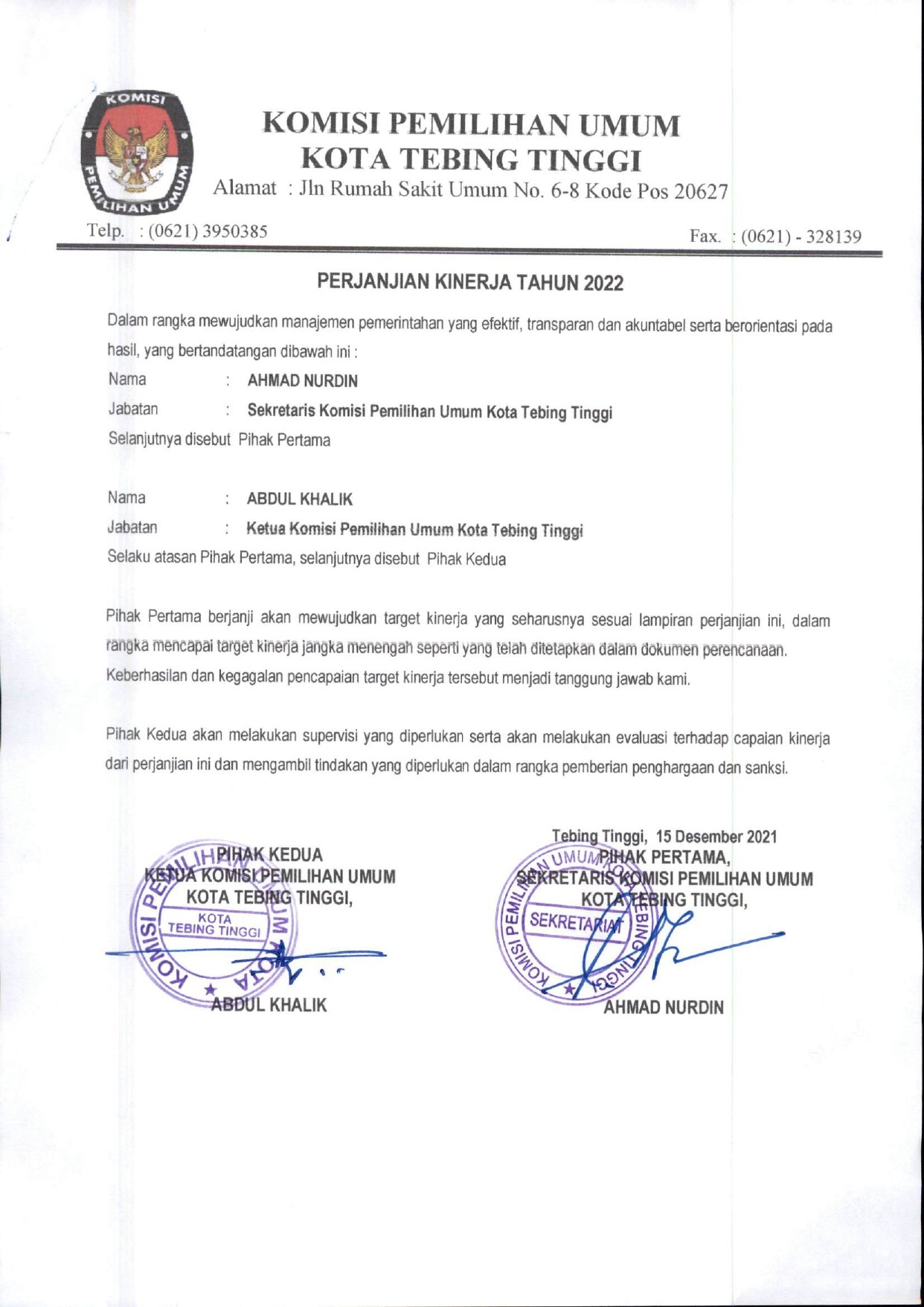 PERJANJIAN KINERJA KPU DAN SEKRETARIAT KPU KOTA TEBING TINGGI TAHUN 2022 Rabu, 15 Desember 2021 07:00 1278 PERJANJIAN KINERJA KPU TAHUN 2022 PERJANJIAN KINERJA SEKRETARIS TAHUN 2022.pdf Baca Selengkapnya