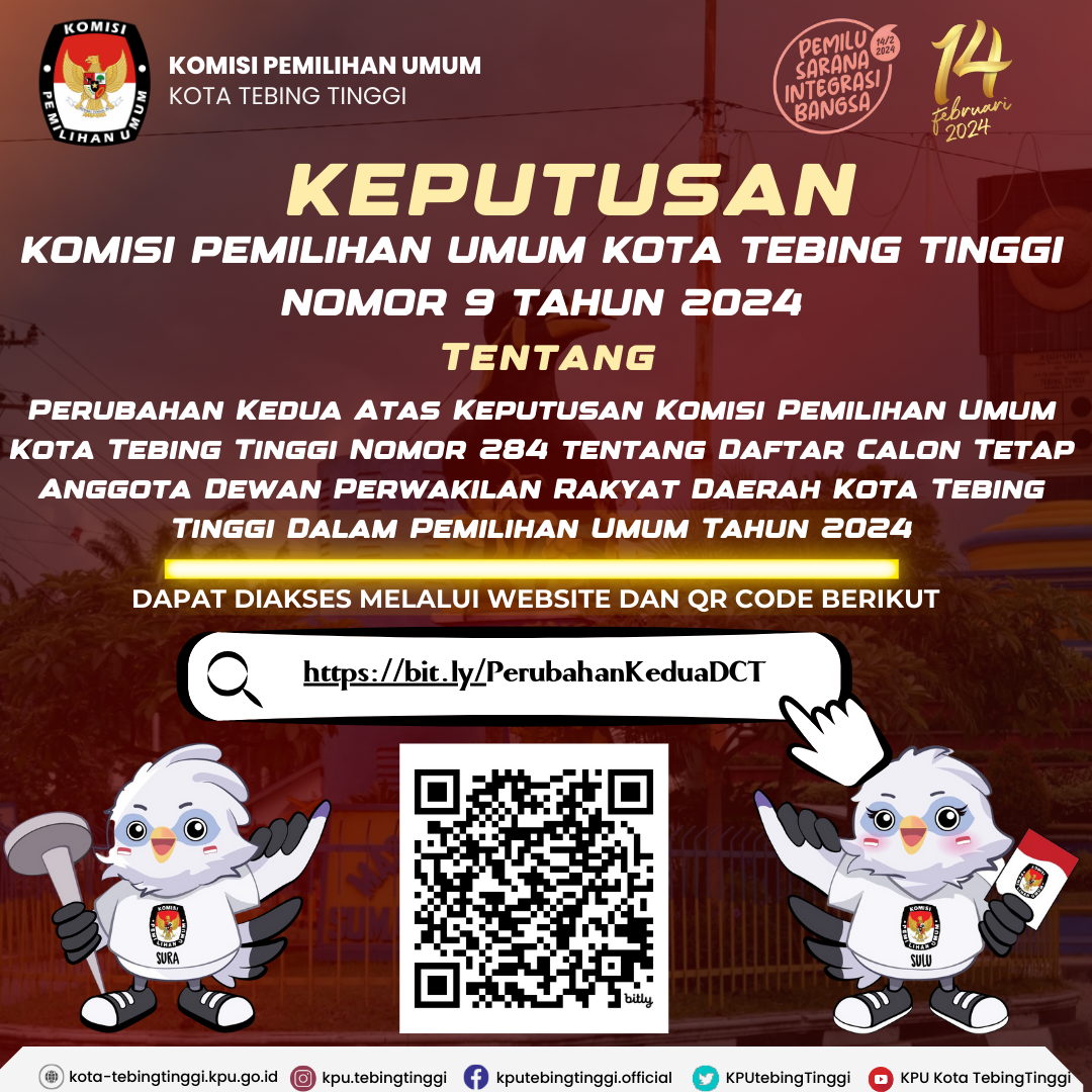 Berikut disampaikan Keputusan Komisi Pemilihan Umum Kota Tebing Tinggi Nomor 9 Tahun 2023 Tentang Perubahan Kedua Atas Keputusan Komisi Pemilihan Umum Kota Tebing Tinggi Nomor 284 Tentang Daftar Calon Tetap Anggota Dewan Perwakilan Rakyat Daerah Kota Tebing Tinggi Dalam Pemilihan Umum Tahun 2024.