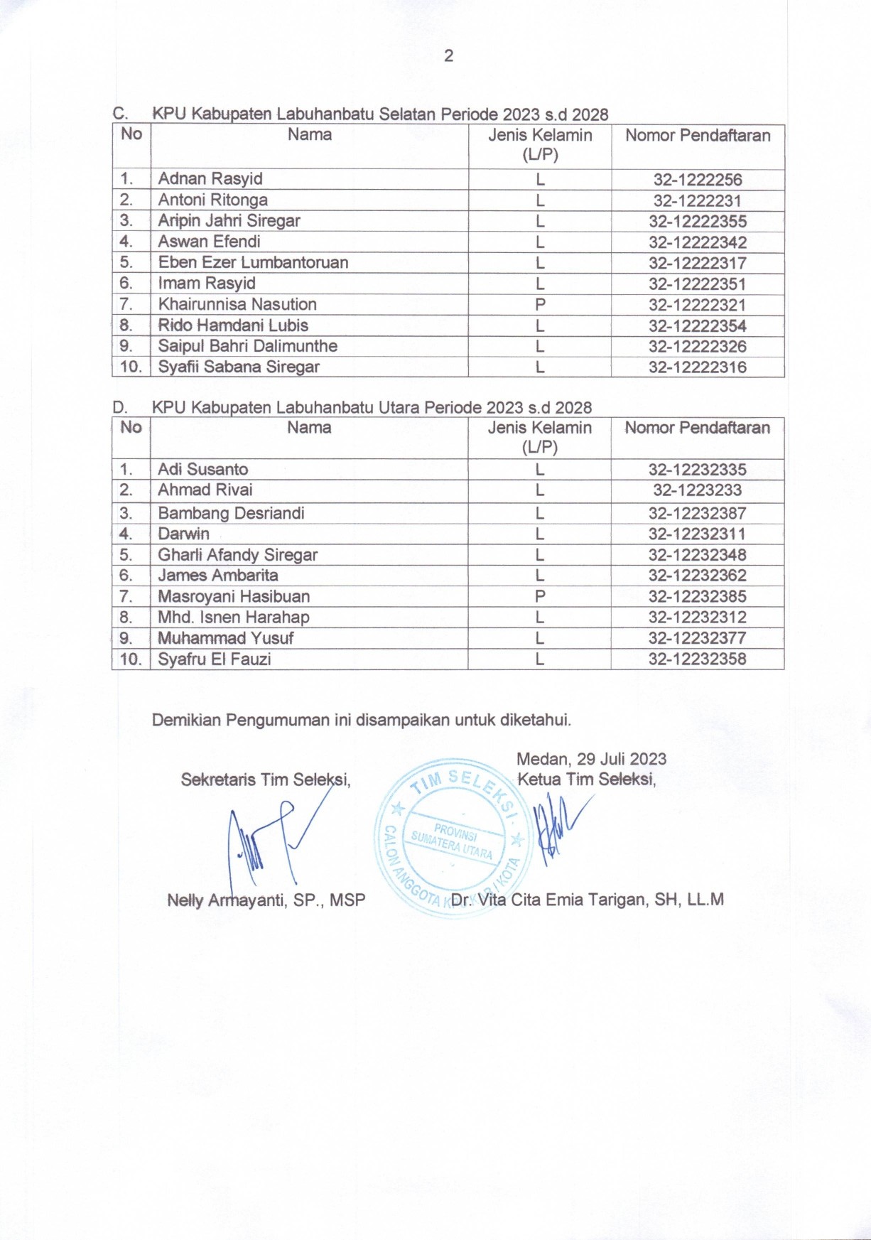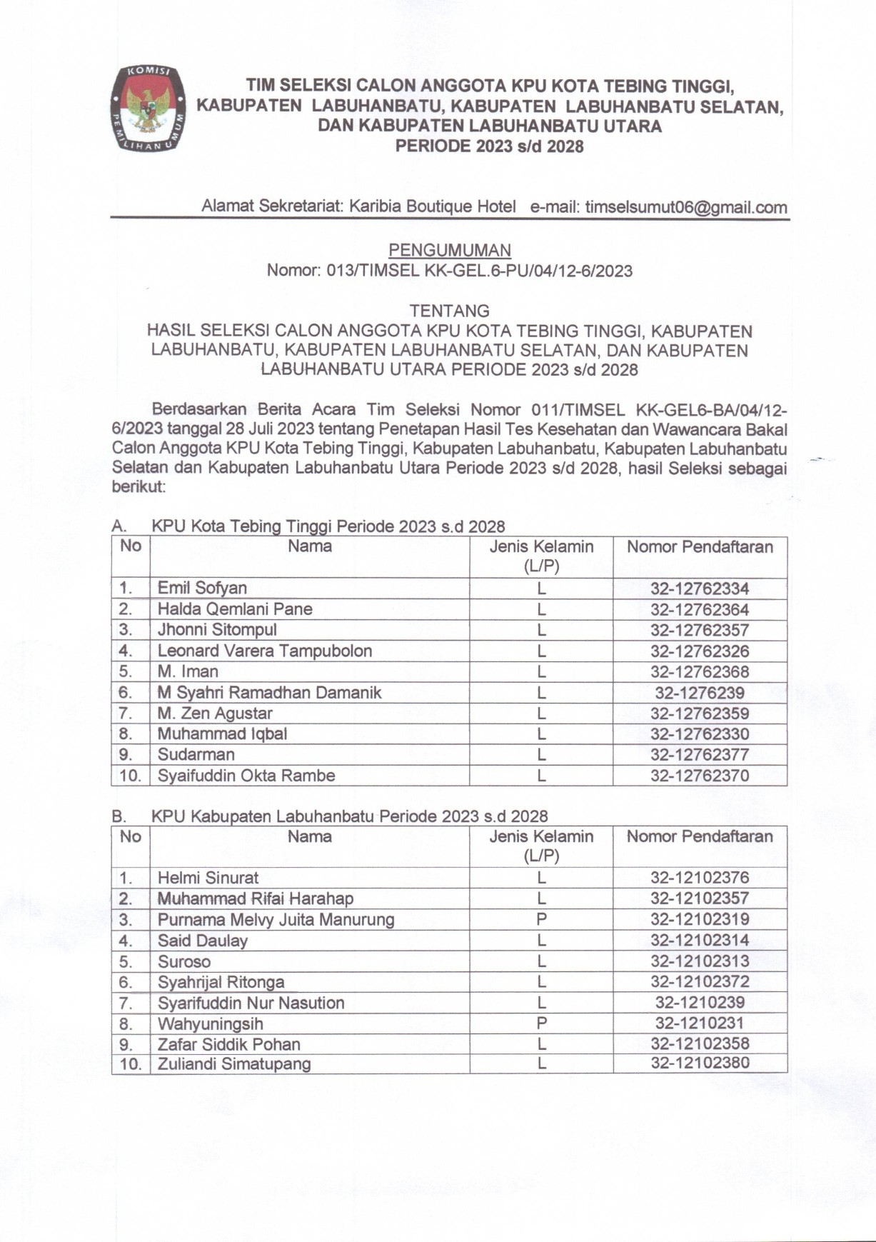 Pengumuman Nomor 013/TIMSEL KK-GEL.6-Pu/04/12-6/2023 Tentang Hasil Seleksi Calon Anggota KPU Kota Tebing Tinggi,