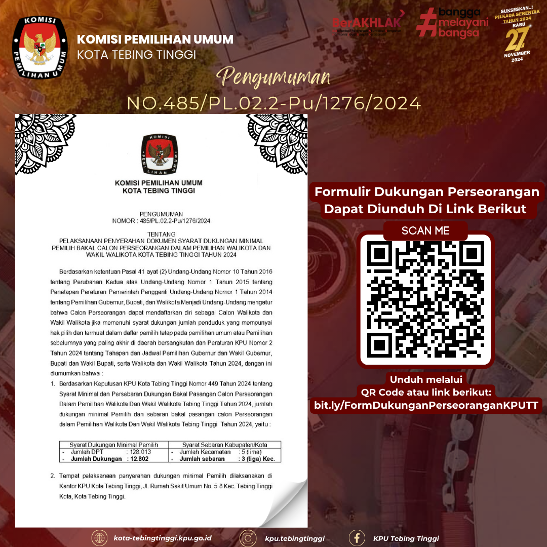 Berikut kami sampaikan Pengumuman No. 485/PL.02.2-Pu/1276/2024 Tentang Pelaksanaan Penyerahan Dokumen Syarat Dukungan Minimal Pemilih Bakal Calon Perseorangan Dalam Pemilihan Walikota dan Wakil Walikota Kota Tebing Tinggi Tahun 2024.