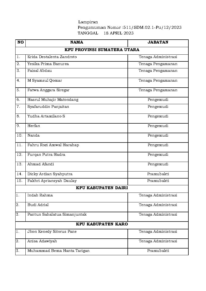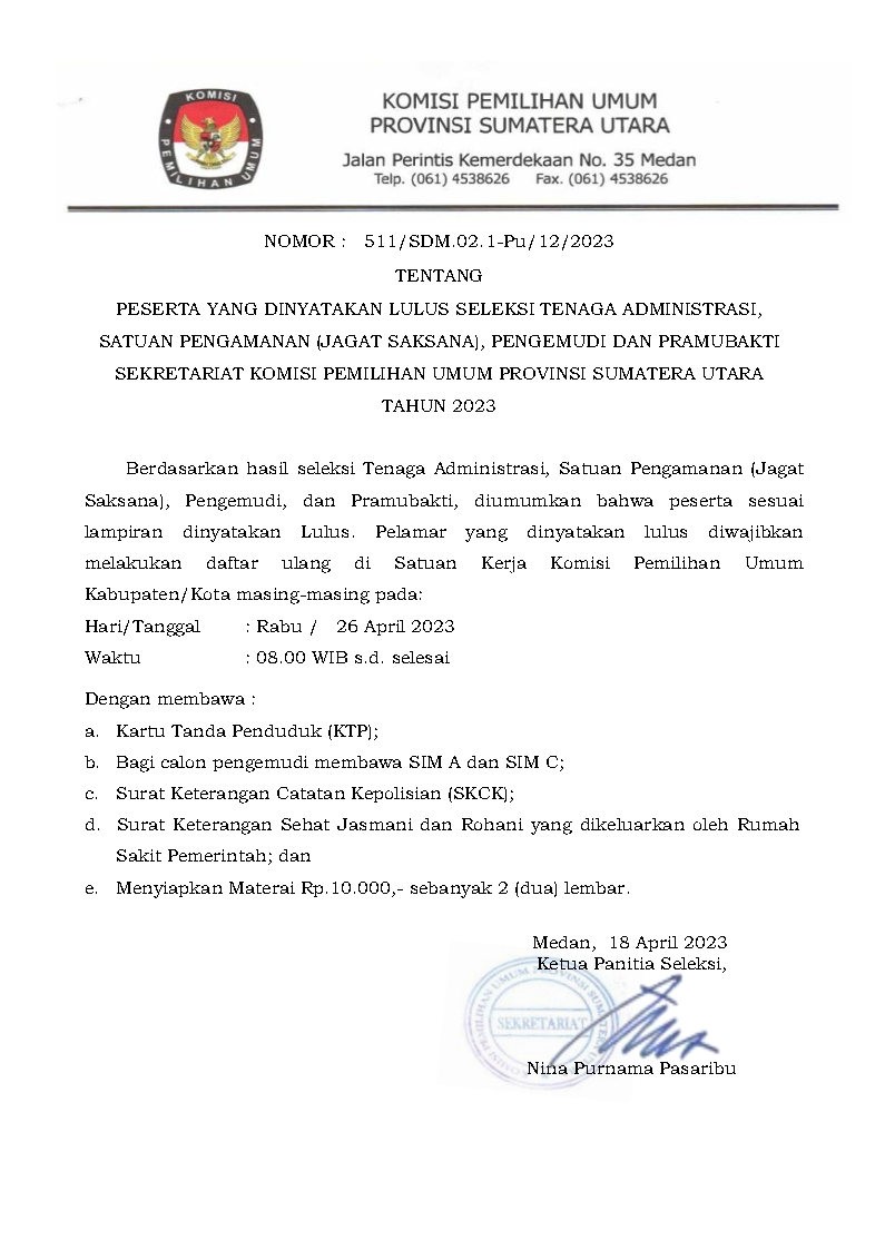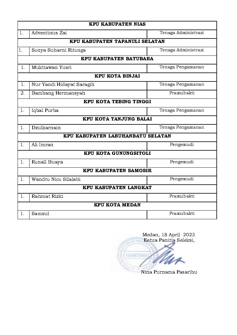 PESERTA YANG DINYATAKAN LULUS SELEKSI TENAGA ADMINISTRASI, SATUAN PENGAMANAN (JAGAT SAKSANA), PENGEMUDI DAN PRAMUBAKTI SEKRETARIAT KOMISI PEMILIHAN UMUM PROVINSI SUMATERA UTARATAHUN 2023