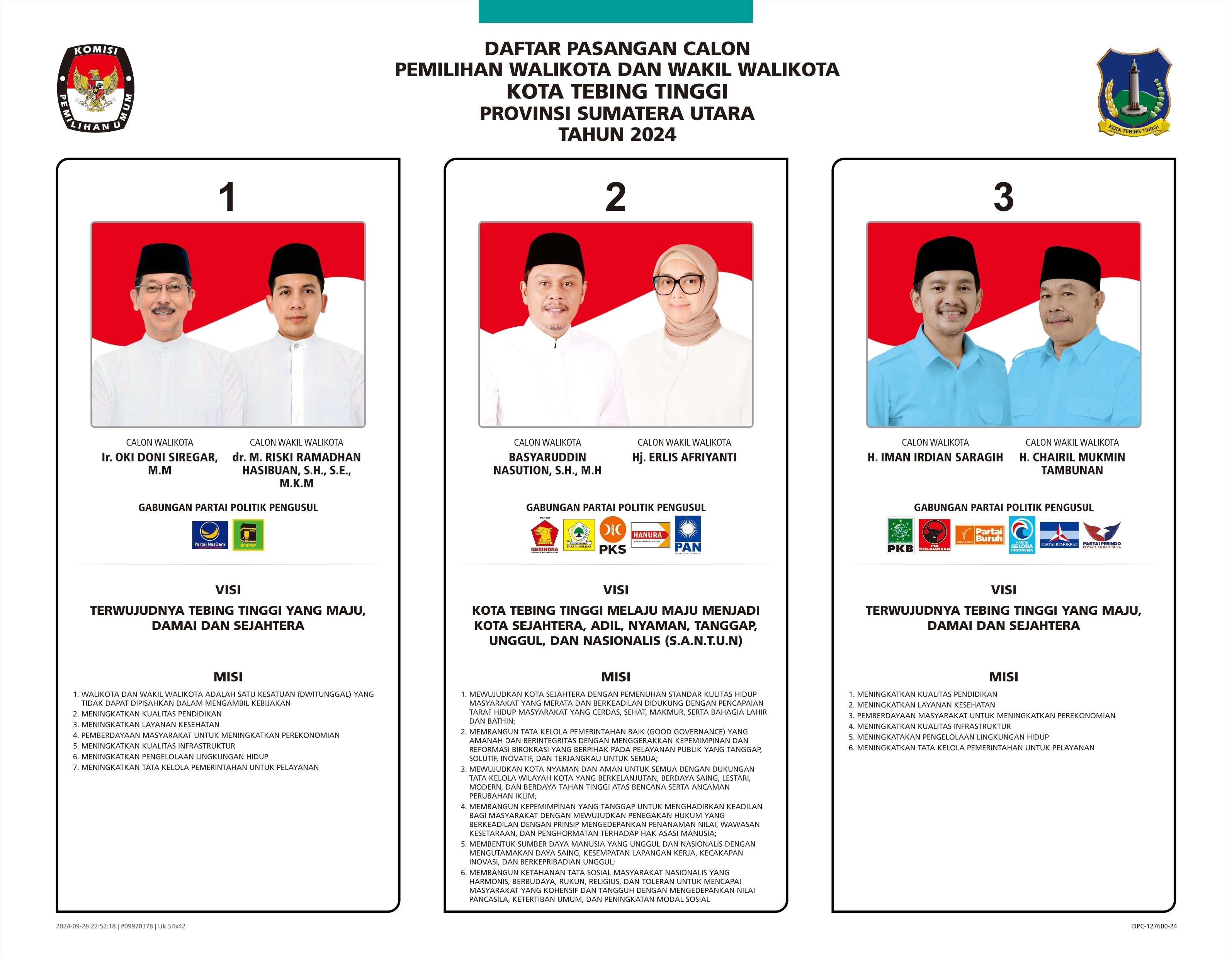 DAFTAR PASANGAN CALON PEMILIHAN WALIKOTA DAN WAKIL WALIKOTA KOTA TEBING TINGGI TAHUN 2024 Jumat, 04 Oktober 2024 07:00 1425 DAFTAR PASANGAN CALON PEMILIHAN WALIKOTA DAN WAKIL WALIKOTA KOTA TEBING TINGGI TAHUN 2024 Baca Selengkapnya