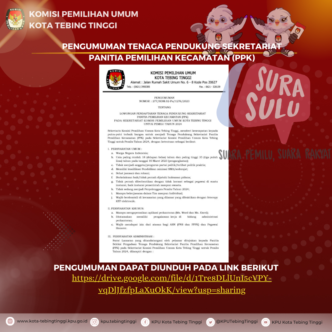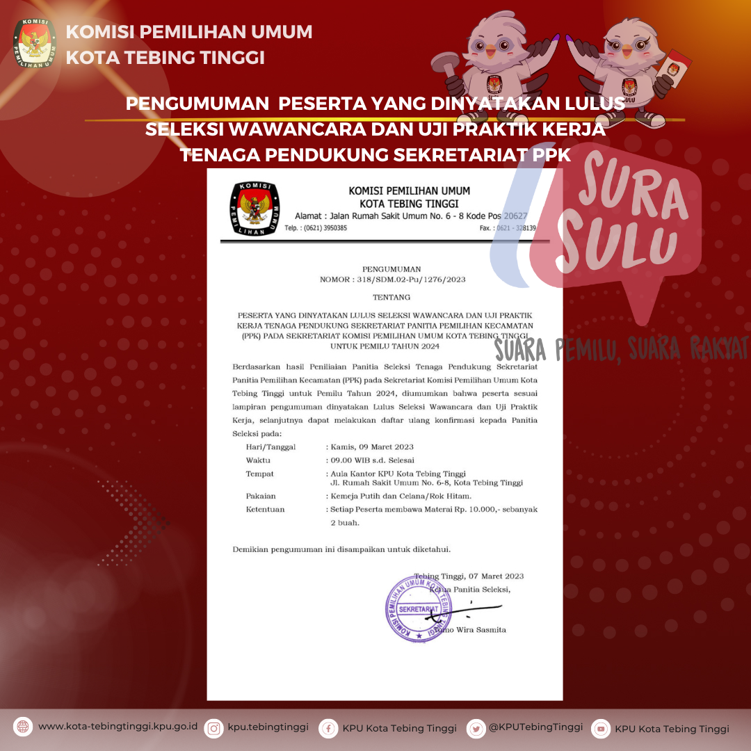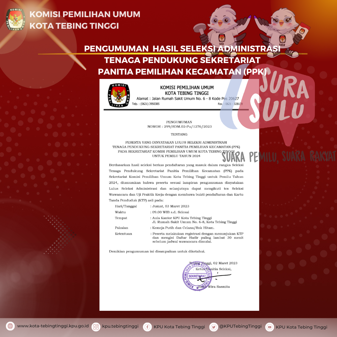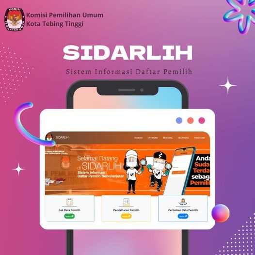 Hai Pemilih di Kota Tebing Tinggi. Menjelang Pemilu 2024 mendatang Anda perlu memastikan apakah sudah terdaftar sebagai pemilih atau belum. KPU Sumatera Utara telah melounching aplikasi SIDARLIH dengan alamat : https://sidarlih-sumut.kpu.go.id/. untuk memudahkan Anda mendaftar sebagai Pemilih.